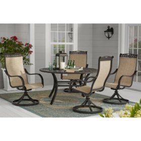Rich mahogany look frames create a low maintenance easy to care for sling dining set with sunbrella fabric.