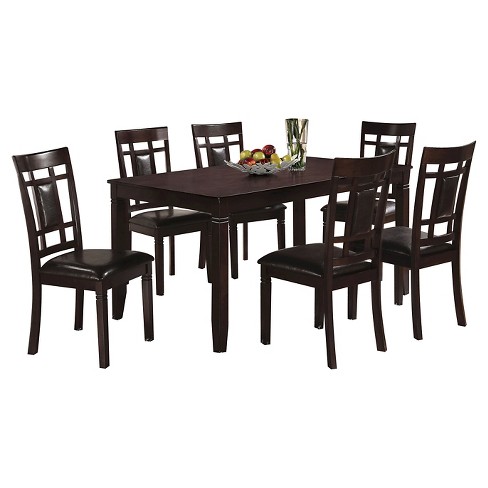 7 piece dining set includes dining table with 18in extention leaf 6 dining chairs so you can fill your dining room or kitchen with furniture you love while saving time and money features.